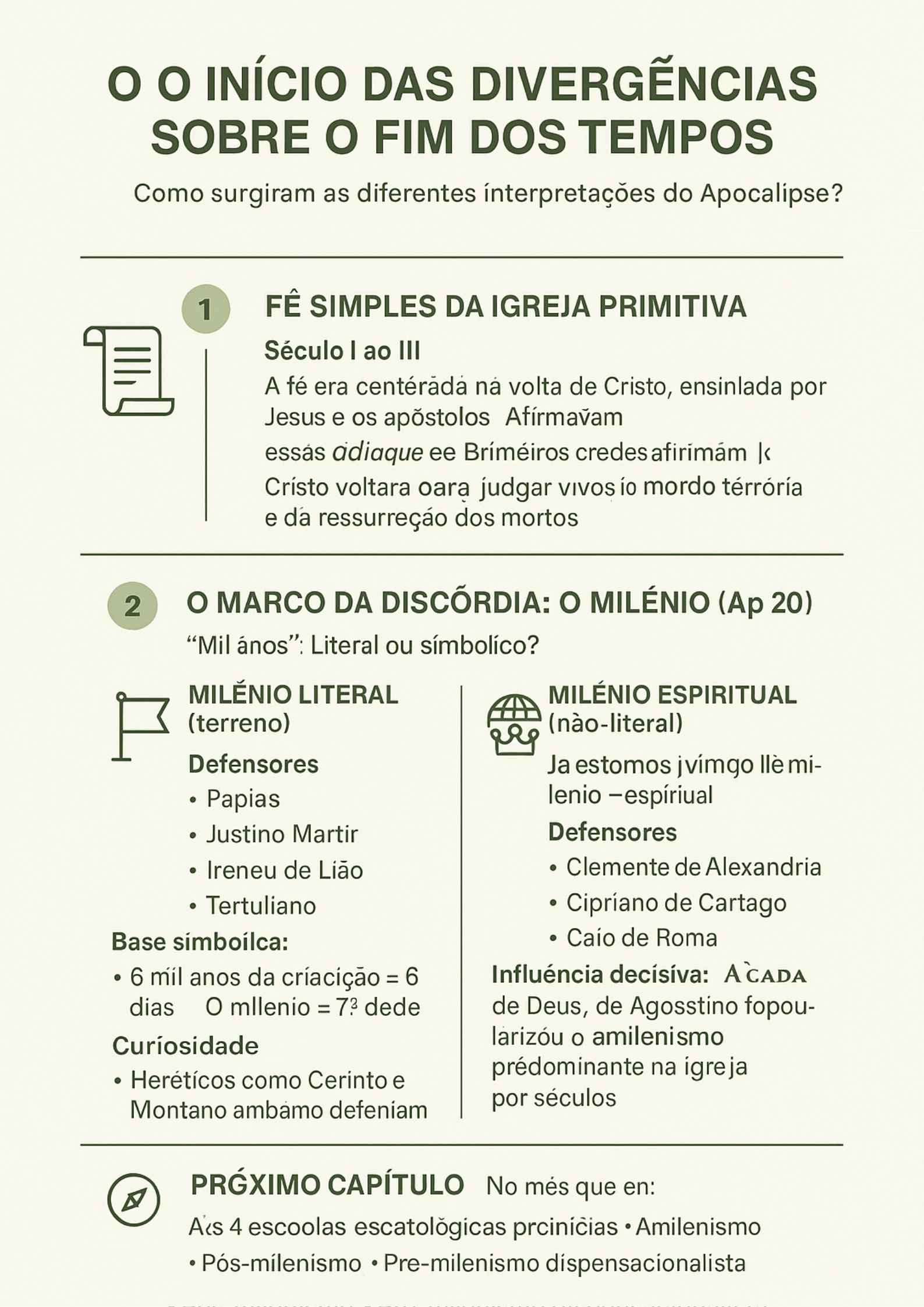 A primeira grande divergência de opinião surgiu em torno de um tema específico: o milênio, mencionado em Apocalipse capítulo 20. O texto fala de um reinado de mil anos. Mas o que significaria esse período? Seria um milênio literal e terreno, ou apenas simbólico e espiritual?