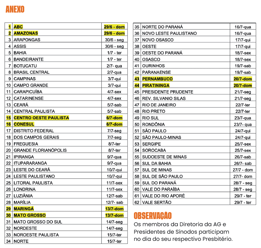 Convocados: Presidentes de Sínodos e Presbitérios, os Representantes na Assembleia Geral, bem como os membros da Diretoria da AG.