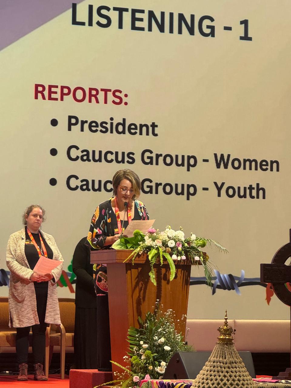 Foi nesta primeira sessão que, juntamente com três outras irmãs, apresentamos na plenária o relatório da mensagem do Grupo de Mulheres. Reforçamos que, embora 83% das igrejas do CMIR permitam a ordenação feminina, apenas 33% dos pastores ordenados são mulheres. Reafirmamos no texto que o ministério das mulheres não é exceção; é vocação divina. Recomendamos ao Conselho das Igrejas Reformadas que promova uma cultura de acolhimento, formação e irmandade entre as mulheres.