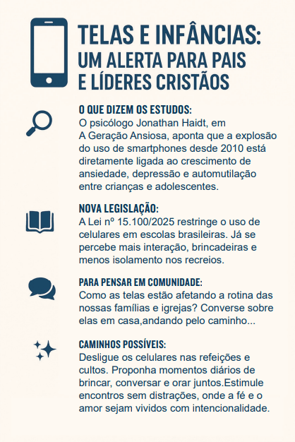 Essa é uma jornada possível — e ela pode começar hoje, com gestos simples: desligar o celular durante as refeições, reservar um tempo diário para brincar, conversar ou orar juntos, sem as interrupções das telas, criar momentos sem distrações, onde o amor possa ser vivido e a fé compartilhada.