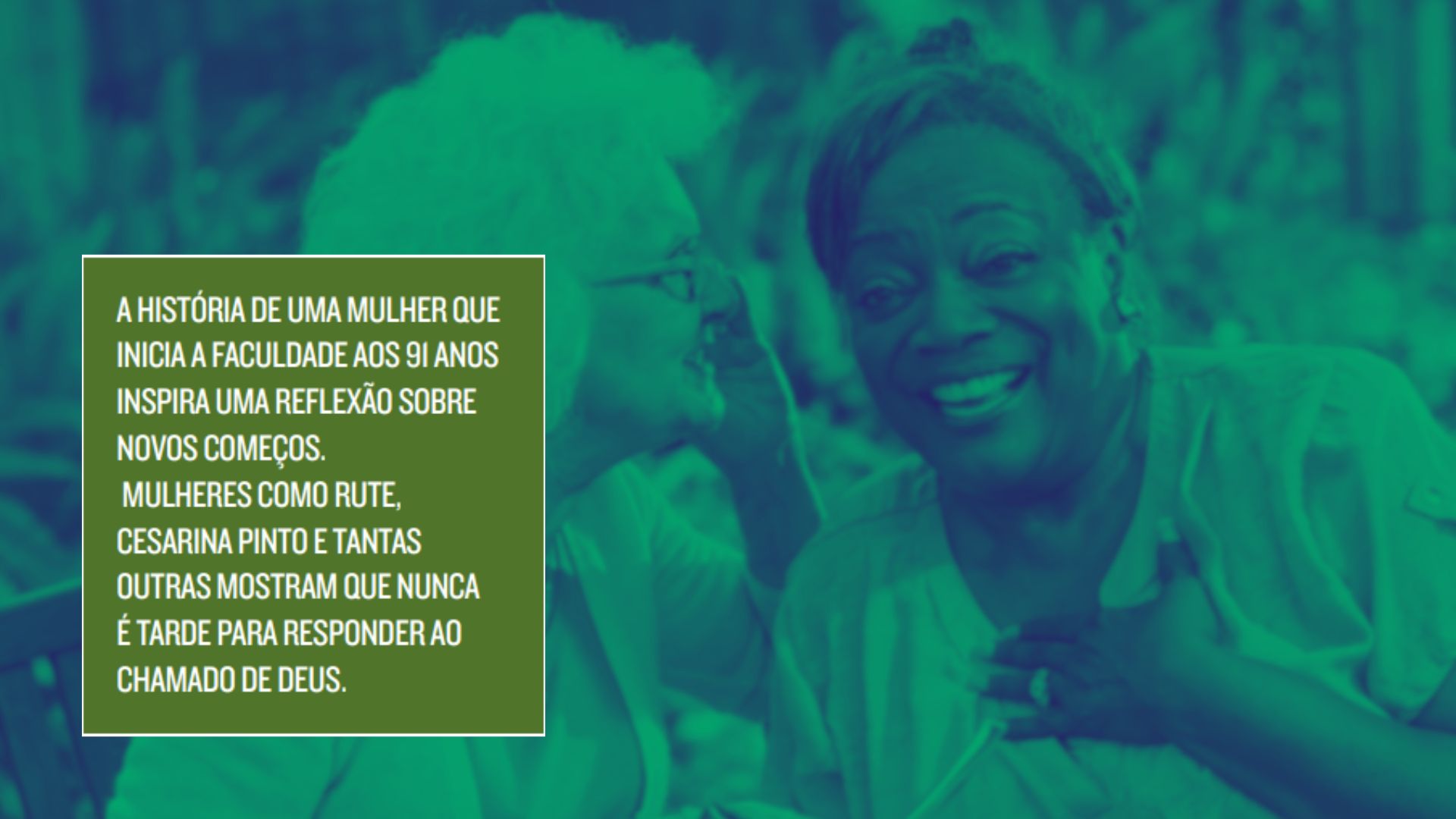 Nas mídias sociais neste mês foi publicada a notícia da Sra. Iolanda Ribeiro Conti, que iniciou um curso de graduação aos 91 anos. Muitas perguntas surgiram tais como: nesta idade começar a estudar em uma faculdade para que? Como irá conseguir estudar ao lado de pessoas muito mais jovens? Será que o tempo para enfrentar um curso superior já não ficou para trás? Enfim, ao lado de perguntas que têm um misto de inquietações e projeções, muitas opiniões de estímulo e encorajamento também surgiram nas redes sociais.
