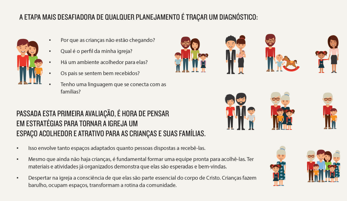 A etapa mais desafiadora de qualquer planejamento é traçar um diagnóstico: por que as crianças não estão chegando? Qual é o perfil da minha igreja? Há um ambiente acolhedor para elas? Os pais se sentem bem recebidos? Tenho uma linguagem que se conecta com as famílias?