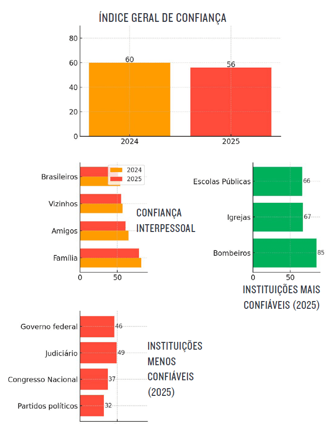 No campo institucional, os bombeiros permanecem na liderando do ranking, com 85 pontos de confiança. Em seguida aparecem as igrejas (67 pontos) e as escolas públicas (66 pontos). As instituições políticas continuam entre as menos confiáveis: partidos políticos registraram apenas 32 pontos; o Congresso Nacional, 37 pontos; o Judiciário, 49 pontos; e o governo federal, 46 pontos.